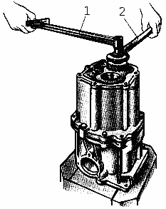 Рис. 179. Затяжка гайки ведущей шестерни при определении монтажного размера С: 1 — динамометрический ключ, 2 — специальный ключ для стопорения шестерни.