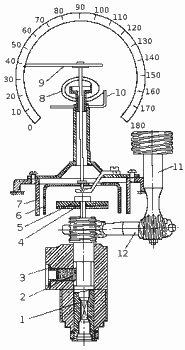 При вращении магнита его магнитный поток пронизывает металлический диск (картушку) 6. В результате в теле картушки индуктируется э.д.с, создающая вихревые токи. Токи в свою очередь тоже создают магнитное поле, которое, взаимодействуя с полюсами вращающего магнита, вызывает поворот картушки в сторону вращения магнита, а вместе с ней и стрелки 9, указывающей скорость движения автомобиля в км/ч.